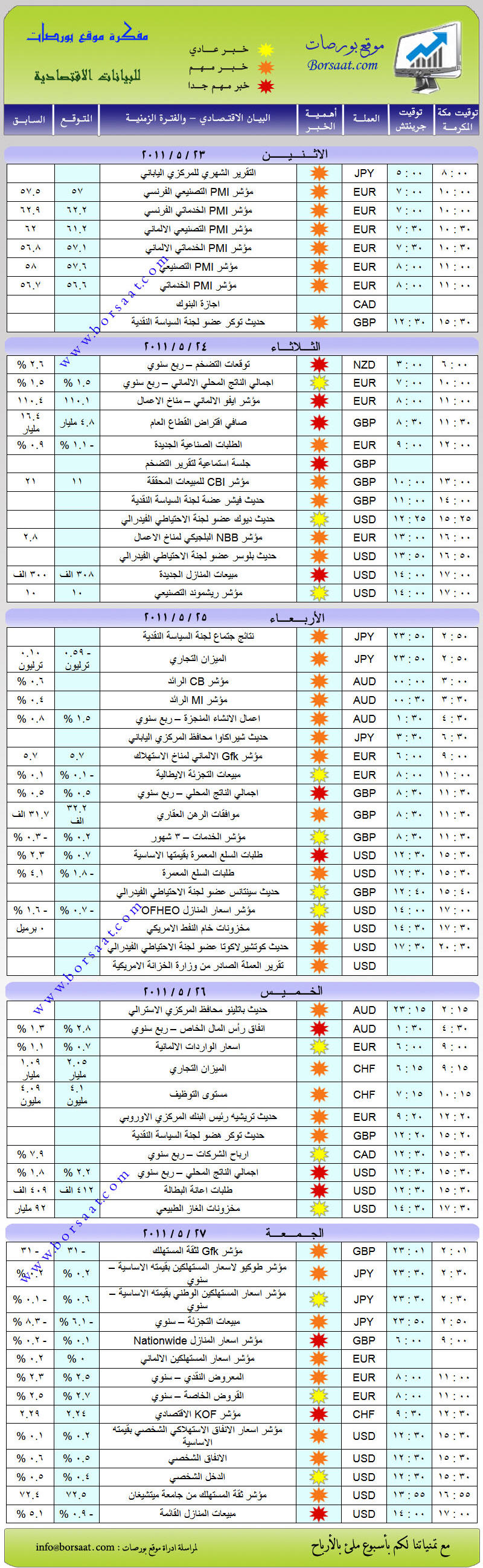 | مفكرة بورصات للبيانات الاقتصادية - الاسبوع من 2/5 حتى 6/5/2011 | فريق الأخبار | منتدى تداول العملات العام | 3 | 04 - 05 - 2011 10:27 PM |