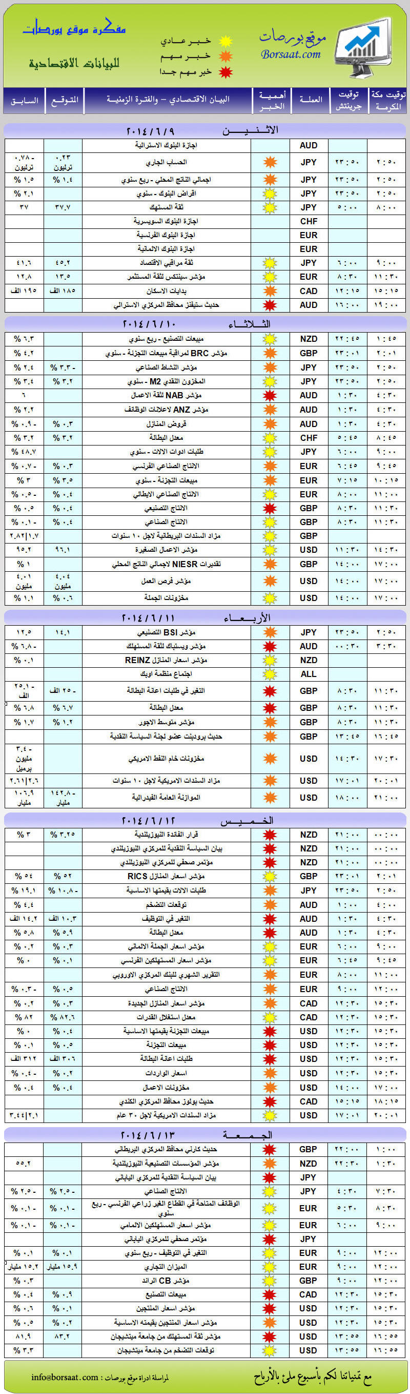 | مفكرة بورصات للبيانات الاقتصادية - الاسبوع من 2/6 حتى 6/6/2014 | فريق الأخبار | منتدى تداول العملات العام | 2 | 02 - 06 - 2014 11:04 AM |