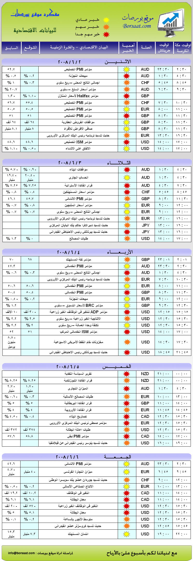 مفكرة موقع بورصات للبيانات الاقتصادية (الاسبوع من 2/ 6 حتى 6/ 6/ 2008)