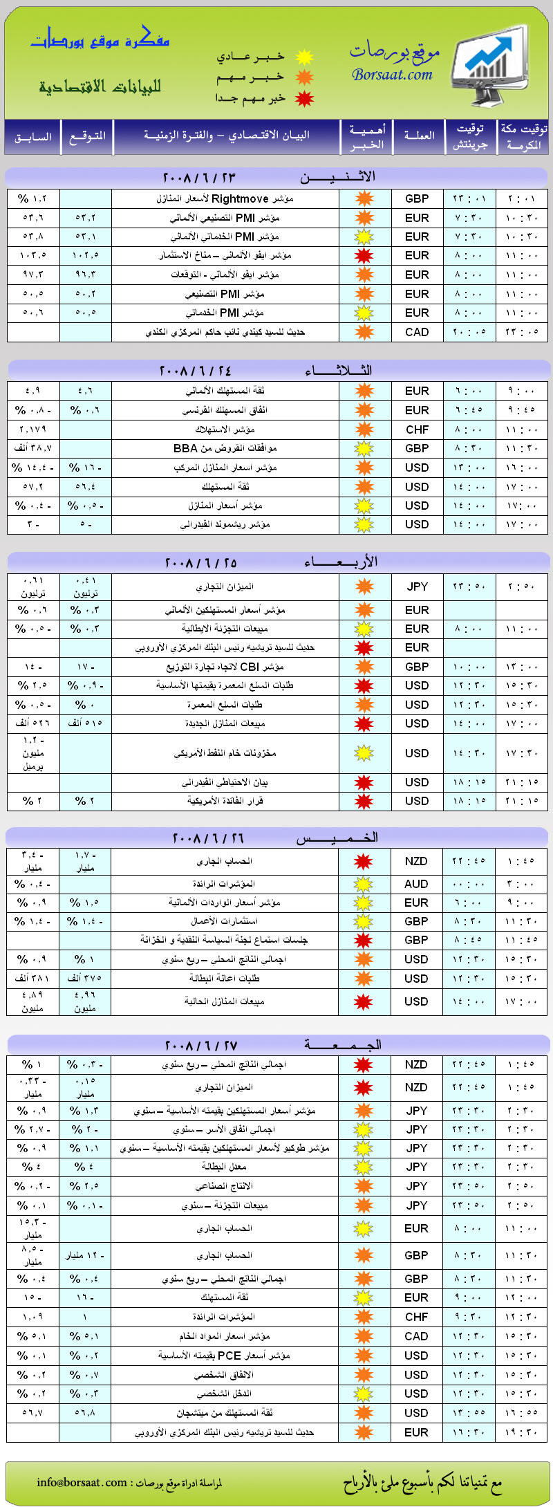مفكرة موقع بورصات للبيانات الاقتصادية (الاسبوع من 23/ 6 حتى 27/ 6/ 2008)